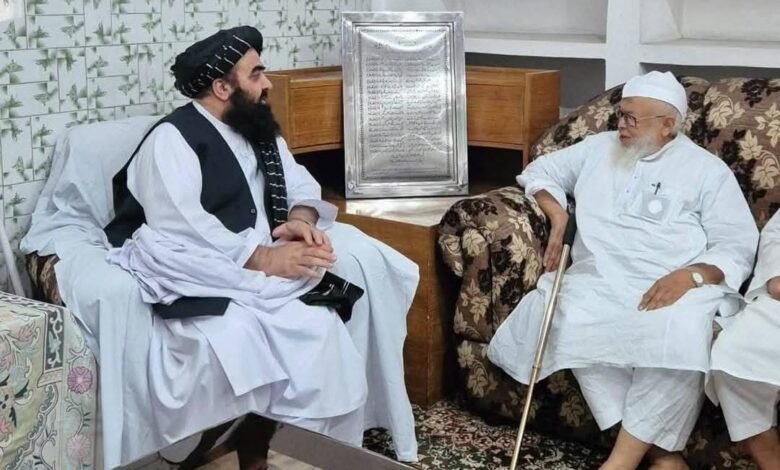 शनिवार को देवबंद पहुंचे अफगानिस्तान के विदेश मंत्री आमिर खान मुतकी ने जमीयत उलेमा हिंद के राष्ट्रीय अध्यक्ष मौलाना अरशद मदनी से भी मुलाकात की। देवबंद के दारुल उलूम में पहुंचने पर मौलाना अरशद मदनी ने अफ़ग़ानिस्तान सरकार के विदेश मंत्री को गले लगा कर स्वागत किया। दोनों के बीच करीब आधे से पूर्ण घंटा तक बातचीत हुई पता जाता है कि इस दौरान इस्लामी शिक्षा और भारत अफगानिस्तान के बीच रिश्तो को और गहरा करने पर भी चर्चा की गई। क्योंकि अफ़ग़ानिस्तान सरकार के विदेश मंत्री का भारत दौरा और देवबंद आना राजनीतिक लिहाज से भी बहुत महत्वपूर्ण है। जिस प्रकार से इस समय अफगानिस्तान और पाकिस्तान के बीच तनाव की स्थिति है और पाकिस्तान वायु सेना के अफगानिस्तान के क्षेत्र में हवाई हमले से वह पाकिस्तान पर आग बबूला है, और इसी दौरान अफगानिस्तान के विदेश मंत्री का भारत दौरा राजनीतिक दृश्य से बड़ा ही कूटनीतिक हो जाता है। क्योंकि भारत सरकार अफगानिस्तान से चाहती है कि वह अपनी धरती भारत के खिलाफ आतंकवाद के रूप में इस्तेमाल न होने दे तो वहीं इसके एवज में भारत सरकार भी अफगानिस्तान की दिल खोलकर इस समय मदद कर रही है। हालांकि मौलाना अरशद मदनी की बात करें तो उनके केंद्र की भाजपा सरकार से कोई अच्छे संबंध नहीं माने जाने है। लेकिन अफगानिस्तान के विदेश मंत्री और मौलाना अरशद मदनी के बीच आपसी बातचीत भविष्य के लिए एक शुभ संकेत माना जा रहा है।